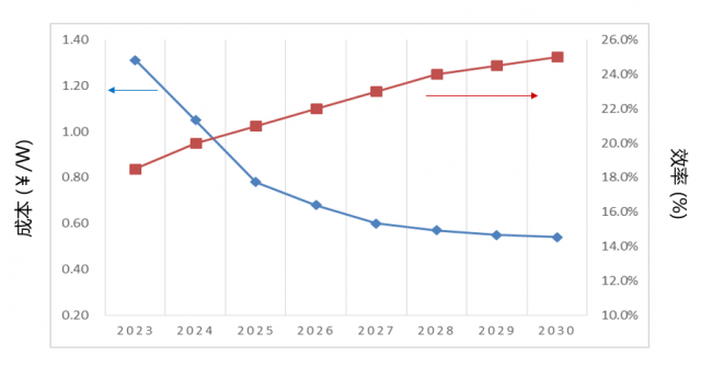 根據(jù)數(shù)據(jù)測算,到2023年平米級鈣鈦礦光伏產(chǎn)品將實(shí)現(xiàn)17-19%的效率,后續(xù)持續(xù)提升至25%。百兆瓦級產(chǎn)線階段成本也將控制在1.0-1.5¥/W之間;1GW級時(shí)能降到~0.8¥/W;10GW級降到~0.6¥/W??紤]到鈣鈦礦組件成本較低,如果其效率達(dá)到17%,價(jià)格達(dá)到1.3¥/W,壽命25年時(shí),就擁有市場競爭力。
