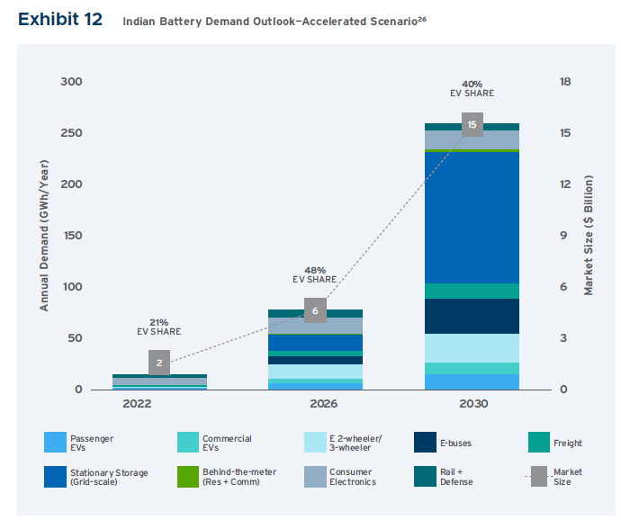 印度在先進電池技術(shù)制造方面的影響力如今微不足道。然而,該國擁有大規(guī)模電池制造的巨大潛力。報告指出,到2030年,印度的電池市場可能超過150億美元(約合1.12萬億盧比),到2030年,印度的電池需求預(yù)計將在“加速情景”中上升到260GWh。