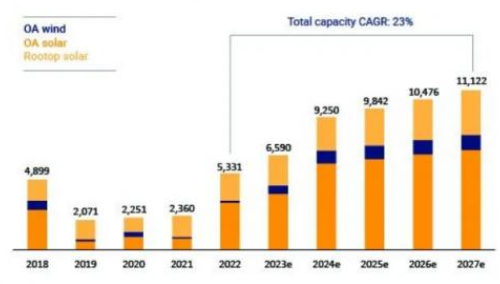 印度的基本關(guān)稅(BCD)進(jìn)口稅以及型號(hào)和制造商批準(zhǔn)名單(ALMM)計(jì)劃在繼續(xù)限制供應(yīng),因此,印度最近一直在經(jīng)歷組件供應(yīng)短缺問(wèn)題。鑒于此,報(bào)告認(rèn)為,在今年剩下的時(shí)間里,增速將會(huì)放緩,但2024年及之后的數(shù)字將開(kāi)始更快的增長(zhǎng)。預(yù)計(jì)2023年,企業(yè)可再生能源容量將增加6.5GW,而2024年將超過(guò)9GW。