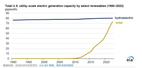 由于太陽能裝機(jī)容量呈指數(shù)級(jí)增長,今年夏天太陽能發(fā)電再次超過水力發(fā)電。2009年至2022年,太陽能裝機(jī)容量平均每年增長44%,水力發(fā)電裝機(jī)容量每年增長不到1%。在我們的STEO中,我們預(yù)計(jì)太陽能發(fā)電量將在2024年首次超過水力發(fā)電量。2019年,年風(fēng)電發(fā)電量超過年水電發(fā)電量。美國太陽能和風(fēng)力發(fā)電的增長遵循類似的模式,兩者都主要跟隨裝機(jī)容量的增長。