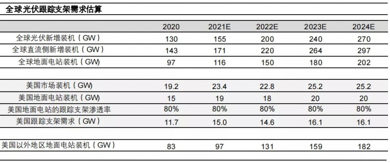 隨著跟蹤支架持續(xù)技術(shù)迭代,其經(jīng)濟性和可靠性等方面的性能持續(xù)提升,相對固定支架的優(yōu)勢有望進一步凸顯,從而推動跟蹤支架滲透率的提升。我們估算,未來3年內(nèi),全球跟蹤支架需求有望達到34%,美國以外地區(qū)的跟蹤支架需求的復(fù)合增速有望達到45%。
