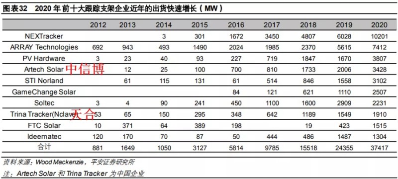 在2012-2020年度全球10大跟蹤企業(yè)出貨量排名中,中信博和天合光能是國內(nèi)僅有的2家進入全球出貨前10的跟蹤支架企業(yè)。