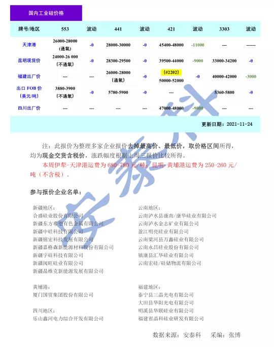 本周國(guó)內(nèi)冶金級(jí)價(jià)格相對(duì)持穩(wěn),化學(xué)級(jí)價(jià)格持續(xù)下跌。目前市場(chǎng)553#、441#價(jià)格與上周持平,421#價(jià)格下跌區(qū)間9000-11000元/噸,3303#價(jià)格下跌3000元/噸,各牌號(hào)FOB出口價(jià)持穩(wěn)運(yùn)行。
