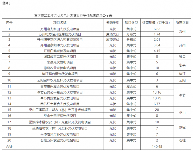 附件:1.重慶市2021年光伏發(fā)電開(kāi)發(fā)建設(shè)競(jìng)爭(zhēng)性配置結(jié)果公示表