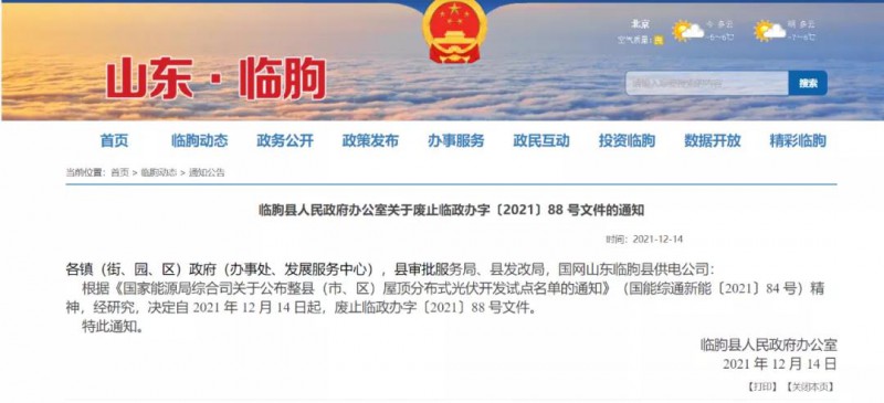 根據(jù)《國(guó)家能源局綜合司關(guān)于公布整縣(市、區(qū))屋頂分布式光伏開發(fā)試點(diǎn)名單的通知》(國(guó)能綜通新能〔2021〕84 號(hào))精神,經(jīng)研究,決定自 2021 年 12 月 14 日起,廢止臨政辦字〔2021〕88 號(hào)文件。