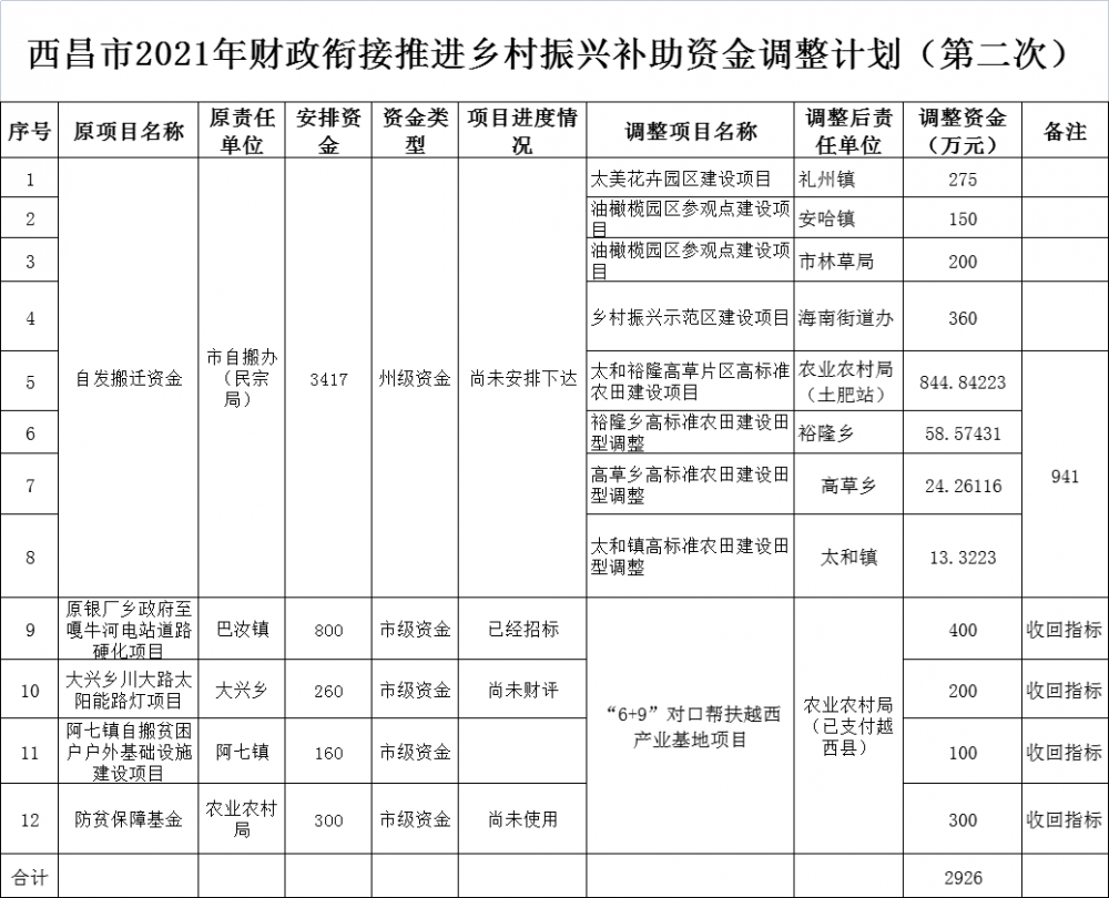 根據(jù)西昌市鄉(xiāng)村振興局《關(guān)于再次調(diào)整使用2021年銜接推進(jìn)鄉(xiāng)村振興補(bǔ)助資金的請(qǐng)示》(西鄉(xiāng)振發(fā)(2021)18號(hào))文件及領(lǐng)導(dǎo)批示,現(xiàn)將2021年下達(dá)市委統(tǒng)戰(zhàn)部(自搬辦):1、自發(fā)搬遷資金1926萬(wàn)元調(diào)整到禮州鎮(zhèn)太美花卉園區(qū)建設(shè)項(xiàng)目275萬(wàn)元、 安哈鎮(zhèn)油橄欖園區(qū)參觀(guān)點(diǎn)建設(shè)項(xiàng)目150萬(wàn)元、市林草局油橄欖園區(qū)參觀(guān)點(diǎn)建設(shè)項(xiàng)目200萬(wàn)元、海南街道辦事處鄉(xiāng)村振興示范區(qū)建設(shè)項(xiàng)目360萬(wàn)元、太和裕隆高草片區(qū)高標(biāo)準(zhǔn)農(nóng)田建設(shè)項(xiàng)目941萬(wàn)元;2、收回以下單位指標(biāo):⑴、巴汝鎮(zhèn)原銀廠(chǎng)鄉(xiāng)政府至嘎牛河電站道路硬化項(xiàng)目資金400萬(wàn)元;⑵、大興鄉(xiāng)川大路太陽(yáng)能路燈項(xiàng)目資金200萬(wàn)元;⑶、阿七鎮(zhèn)自搬貧困戶(hù)戶(hù)外基礎(chǔ)設(shè)施建設(shè)項(xiàng)目資金100萬(wàn)元;⑷、農(nóng)業(yè)農(nóng)村局防貧保障基金300萬(wàn)元;3、將西昌市援建越西縣 “6+9”對(duì)口幫扶越西產(chǎn)業(yè)基地項(xiàng)目1000萬(wàn)元調(diào)入鄉(xiāng)村振興項(xiàng)目,給予在網(wǎng)上公示。