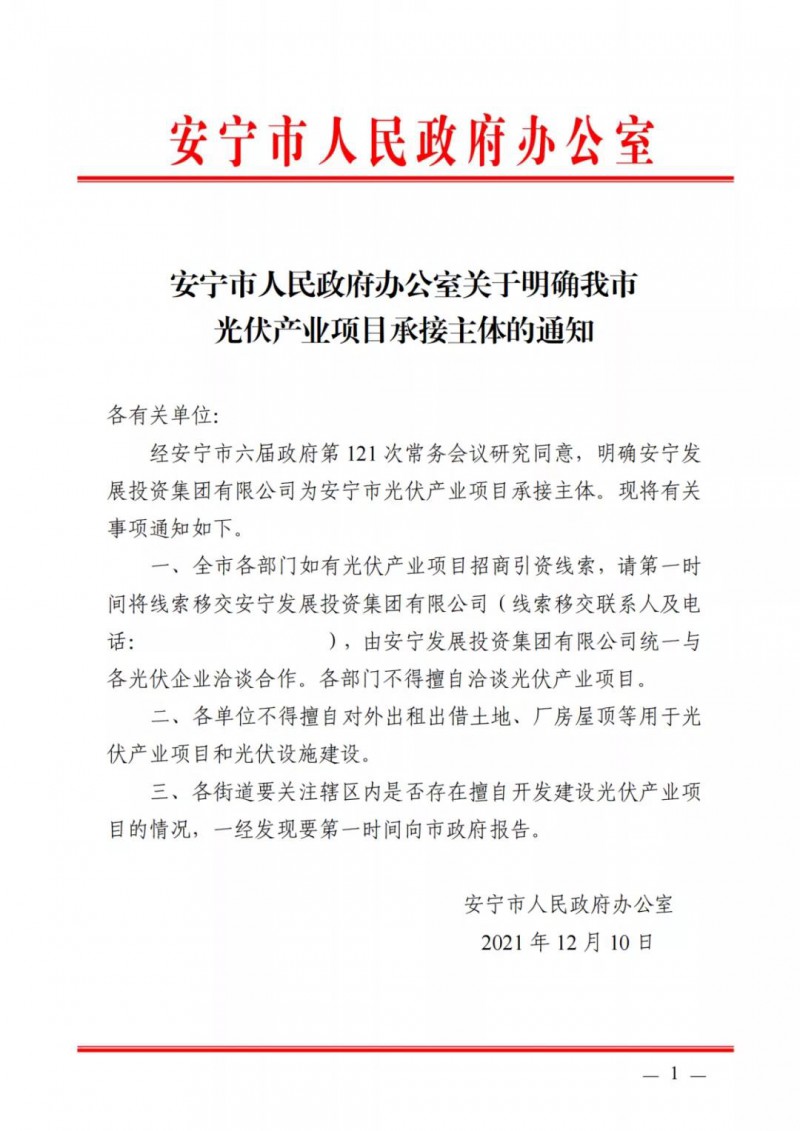 12月10日,安寧市政府下發(fā)《關(guān)于明確我市光伏產(chǎn)業(yè)項(xiàng)目承接主體的通知》,通知明確安寧發(fā)展投資集團(tuán)有限公司為安寧市光伏產(chǎn)業(yè)項(xiàng)目承接主體。
