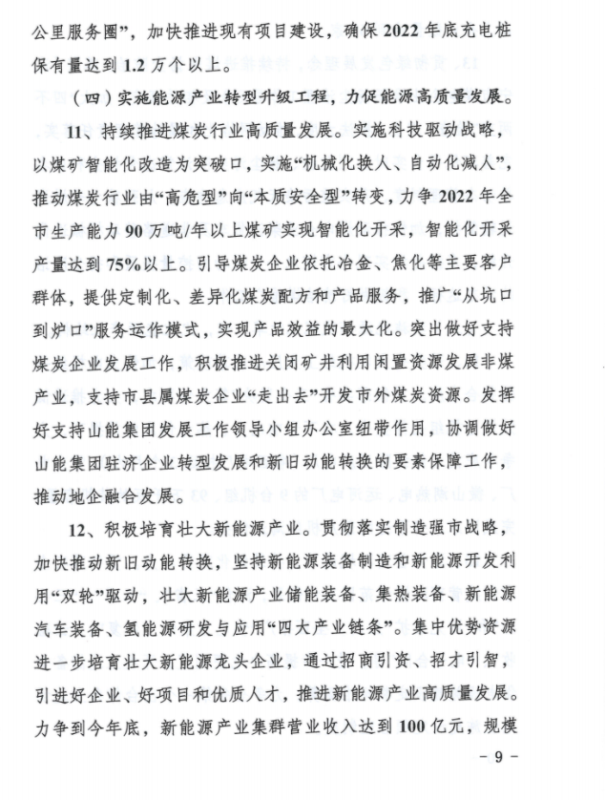 持續(xù)提升新能源和可再生能源開發(fā)利用規(guī)模。落實市政府《關(guān)于加快新能源和可再生能源高質(zhì)量發(fā)展意見》,統(tǒng)籌優(yōu)化新能源開發(fā)布局,提質(zhì)升級發(fā)展“光伏+”工程,穩(wěn)步有序發(fā)展生物質(zhì)能,打造新能源多元化利用示范基地。一是突出抓好華能嘉祥梁寶寺150兆瓦“農(nóng)光互補(bǔ)”項目(一期)等8個納入電網(wǎng)接入和消納意見的新能源項目建設(shè),積極推進(jìn)嘉祥、梁山、魚臺、鄒城和曲阜整縣分布式光伏規(guī)?;_發(fā)試點工作。全力支持時代永福濟(jì)寧漁光互補(bǔ)項目和山能集團(tuán)在濟(jì)寧分布式光伏項目建設(shè)。二是大力發(fā)展智慧能源,積極推進(jìn)泗水海螺工業(yè)園區(qū)“零購電”源網(wǎng)荷儲一體化智慧示范園區(qū)和魯抗鄒城園區(qū)綠色能源示范項目建設(shè)。三是探索發(fā)展儲能產(chǎn)業(yè),在用戶側(cè)、電源側(cè)和電網(wǎng)側(cè)分類推進(jìn)儲能示范工程建設(shè),力爭2022年建成11萬千瓦左右的儲能設(shè)施。