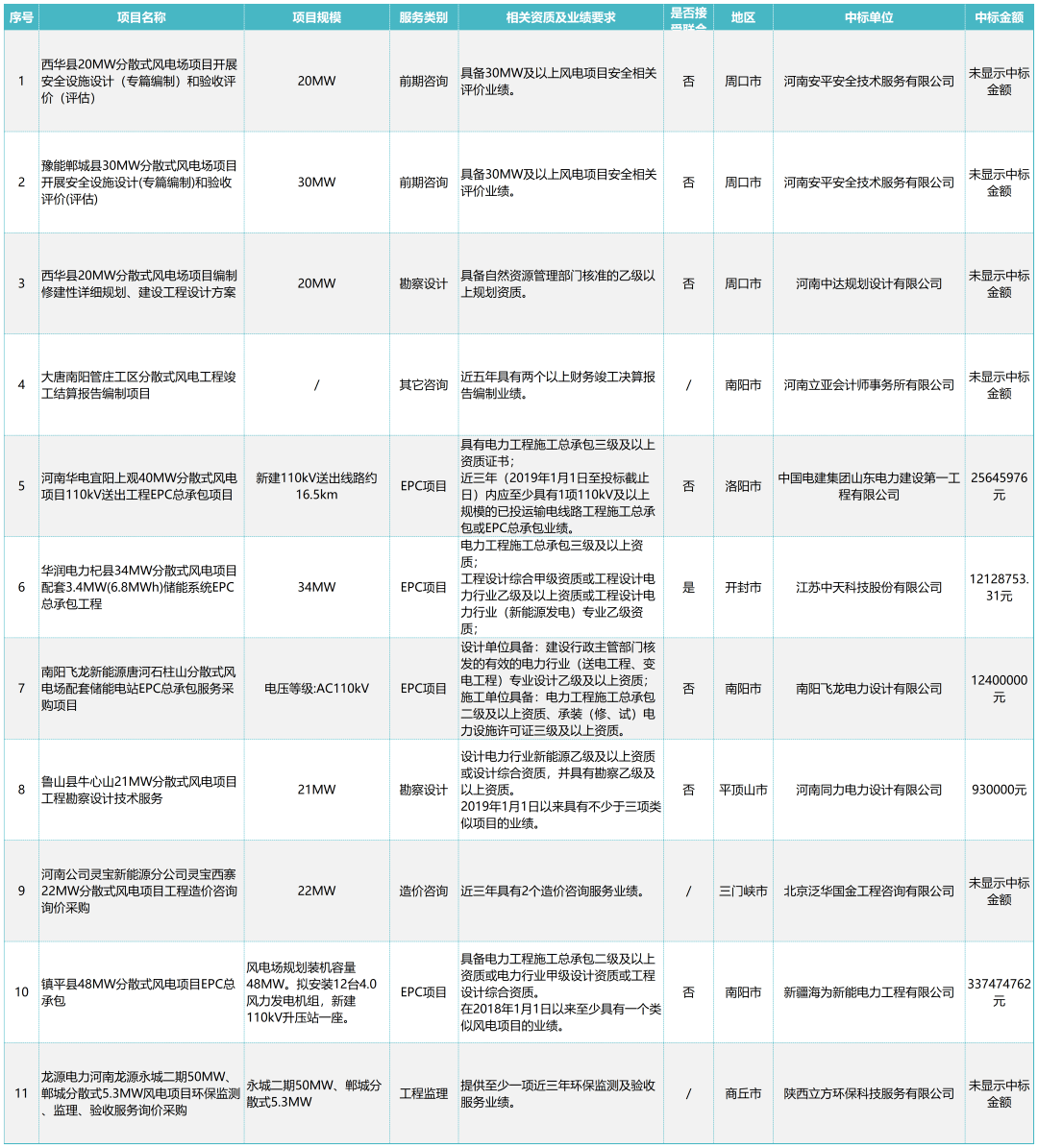 依據(jù)小海帶平臺2022年1月至7月統(tǒng)計數(shù)據(jù)顯示,河南省目前分散式風(fēng)電項目共11項,服務(wù)內(nèi)容涵蓋勘察設(shè)計、造價咨詢、工程監(jiān)理等,其中主要為勘察設(shè)計與前期咨詢,大部分項目還處于工程進展的前期階段。風(fēng)電項目占電力項目的比例不足20%,分散式風(fēng)電項目占風(fēng)電項目的比例僅22%左右,當前整體規(guī)模并不大。