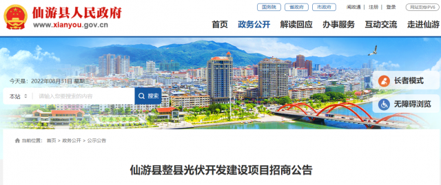 日前,福建仙游縣發(fā)布整縣光伏開發(fā)建設項目招商公告,公告提出投資人須提供引入的產業(yè)項目建設方案和承諾函。引入總投資不少于5億元的涉及新能源產業(yè)鏈項目,主要為:新能源、新型電化學儲能領域核心材料生產、先進裝備制造;鋰電池循環(huán)利用;能源領域精密設備、電子設備先進制造等至少一個。