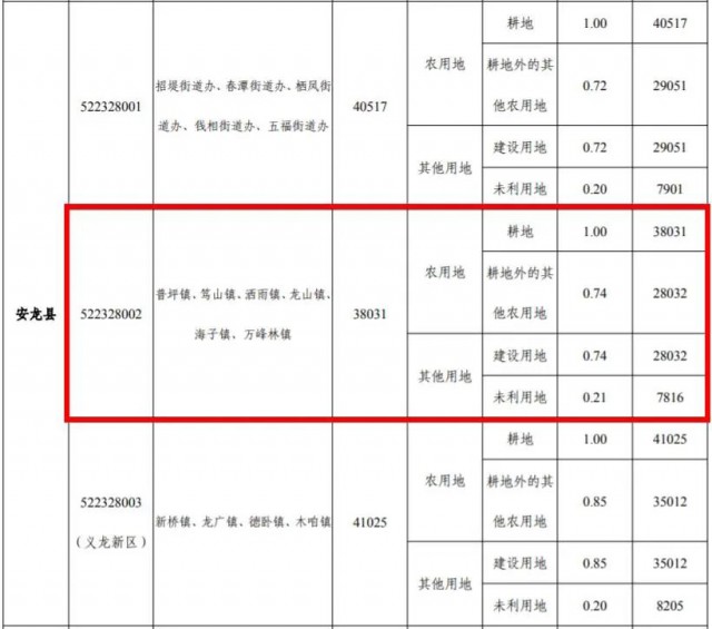 根據(jù)此前發(fā)布的《州人民政府關(guān)于公布實(shí)施黔西南州征地區(qū)片綜合地價(jià)補(bǔ)償更新標(biāo)準(zhǔn)的通知》(黔西南府函〔2020〕69號(hào))補(bǔ)償標(biāo)準(zhǔn),安龍縣普坪鎮(zhèn)區(qū)片綜合地價(jià)為38031元/畝,其中農(nóng)用地耕地補(bǔ)償標(biāo)準(zhǔn)為38031元/畝,耕地外的其他農(nóng)用地補(bǔ)償標(biāo)準(zhǔn)為28032元/畝。