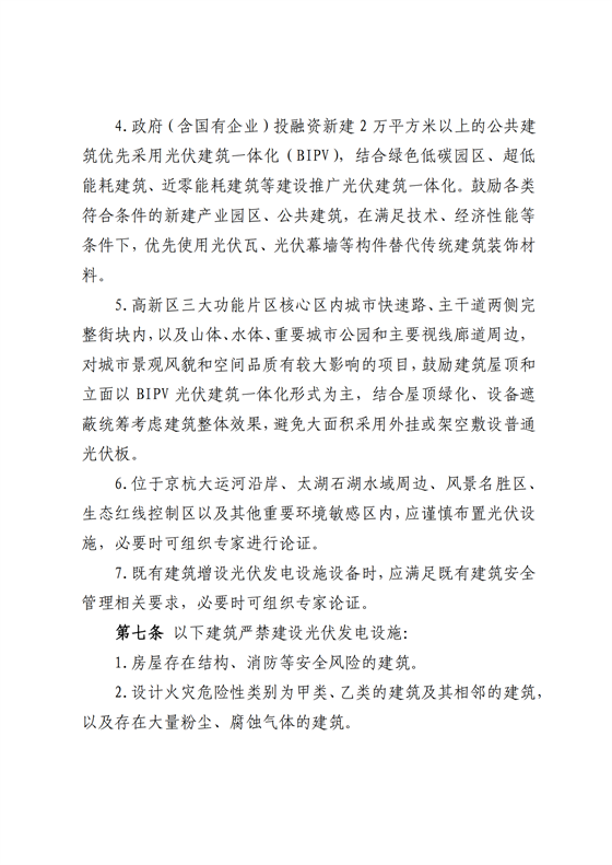 4.政府(含國有企業(yè))投融資新建2萬平方米以上的公共建筑優(yōu)先采用光伏建筑一體化(BIPV),結(jié)合綠色低碳園區(qū)、超低能耗建筑、近零能耗建筑等建設(shè)推廣光伏建筑一體化。鼓勵各類符合條件的新建產(chǎn)業(yè)園區(qū)、公共建筑,在滿足技術(shù)、經(jīng)濟(jì)性能等條件下,優(yōu)先使用光伏瓦、光伏幕墻等構(gòu)件替代傳統(tǒng)建筑裝飾材料。