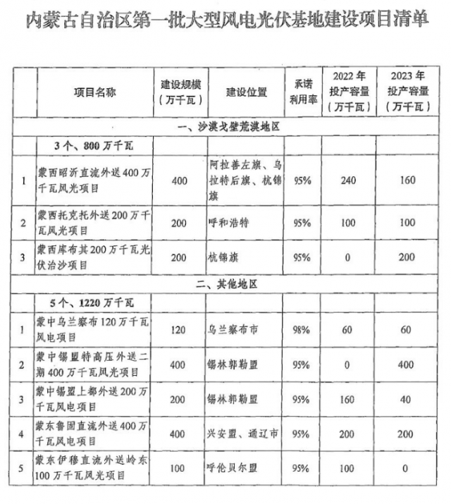 根據(jù)此前公開信息顯示,第一批風(fēng)光大基地總規(guī)模約97.05GW(《總規(guī)模97.05GW!第一批大型風(fēng)、光大基地項目名單發(fā)布》),主要布局在內(nèi)蒙、青海、甘肅等19個省份,包括2GW魯北鹽堿灘基地、2.6GW廣西橫州基地、青海海南、海西10.9GW基地、陜五一期6GW外送基地、渭南3.53GW基地、內(nèi)蒙古2GW光伏治沙……等等均已悉數(shù)開工。其中,內(nèi)蒙古第一批8個國家大型風(fēng)電光伏基地項目共計2020萬千瓦。
