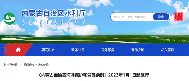 2022年11月23日,內(nèi)蒙古自治區(qū)第十三屆人民代表大會常務(wù)委員會第三十八次會議通過《內(nèi)蒙古自治區(qū)河湖保護(hù)和管理?xiàng)l例》,現(xiàn)予公布,自2023年1月1日起施行。