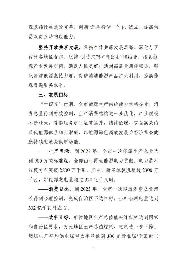 生產目標:到2025年,全市一次能源生產總量達到900萬噸標準煤,全部由可再生能源電力貢獻。電力裝機規(guī)模力爭突破2800萬千瓦,其中,新能源裝機超過2300萬千瓦,新能源發(fā)電量超過320億千瓦時。