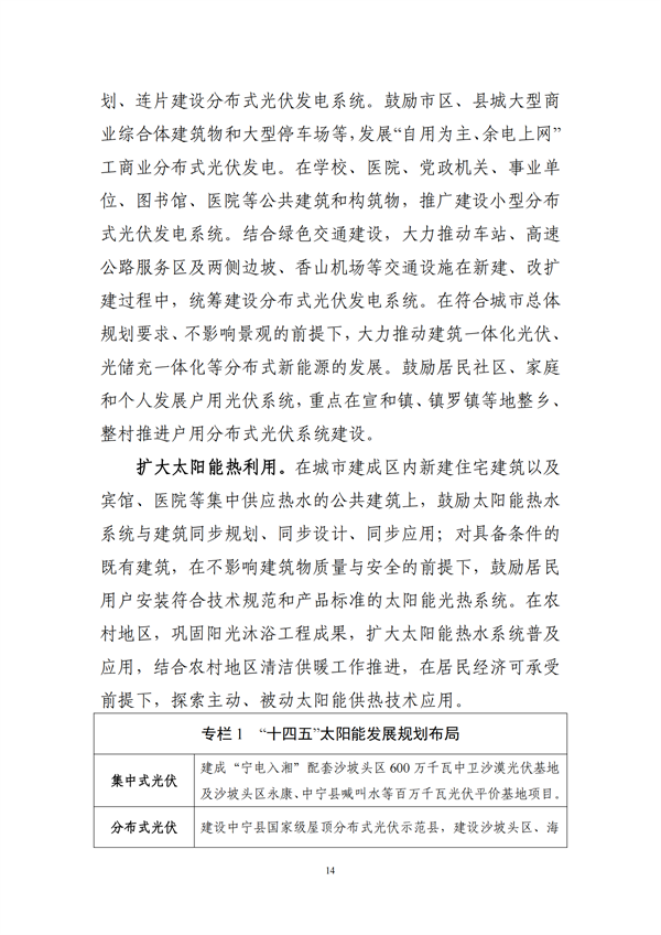 加快開發(fā)分布式光伏資源。開展中寧縣、沙坡頭區(qū)、海原縣整縣屋頂分布式光伏開發(fā)試點。在中衛(wèi)工業(yè)園區(qū)、中寧工業(yè)園區(qū)和海興開發(fā)區(qū),科學選取工業(yè)廠房及附屬空閑場地,統(tǒng)一規(guī)劃、連片建設分布式光伏發(fā)電系統(tǒng)。在學校、醫(yī)院、黨政機關、事業(yè)單位、圖書館、醫(yī)院等公共建筑和構筑物,推廣建設小型分布式光伏發(fā)電系統(tǒng)。結合綠色交通建設,大力推動車站、高速公路服務區(qū)及兩側邊坡、香山機場等交通設施在新建、改擴建過程中,統(tǒng)籌建設分布式光伏發(fā)電系統(tǒng)。在符合城市總體規(guī)劃要求、不影響景觀的前提下,大力推動建筑一體化光伏、光儲充一體化等分布式新能源的發(fā)展。鼓勵居民社區(qū)、家庭和個人發(fā)展戶用光伏系統(tǒng),重點在宣和鎮(zhèn)、鎮(zhèn)羅鎮(zhèn)等地整鄉(xiāng)、整村推進戶用分布式光伏系統(tǒng)建設。