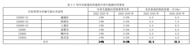 12月26日,紹興市建設(shè)局公示《紹興市綠色建筑專項規(guī)劃(2022-2030)(草案)》,其中提到,新建民用建筑(農(nóng)民自建住宅除外),應(yīng)當(dāng)按照國家和省有關(guān)標(biāo)準(zhǔn)利用可再生能源??稍偕茉蠢迷O(shè)施應(yīng)當(dāng)與建筑主體一體化設(shè)計,同步施工、同步驗收。新建民用建筑應(yīng)采用可再生能源系統(tǒng),應(yīng)配置太陽能系統(tǒng),滿足浙江省工程建設(shè)標(biāo)準(zhǔn)《民用建筑可再生能源應(yīng)用核算標(biāo)準(zhǔn)》的要求。 至2025 年,紹興市各縣(市、區(qū))新建民用建筑可再生能源應(yīng)用核算替代率達(dá)到 8%,太陽能光伏系統(tǒng)的裝機容量達(dá)到 22.0 萬 kWp。至 2030 年,紹興市各縣(市、區(qū))新建民用建筑可再生能源應(yīng)用核算替代率達(dá)到 10%,太陽能光伏系統(tǒng)的裝機容量達(dá)到 33.0 萬 kWp。