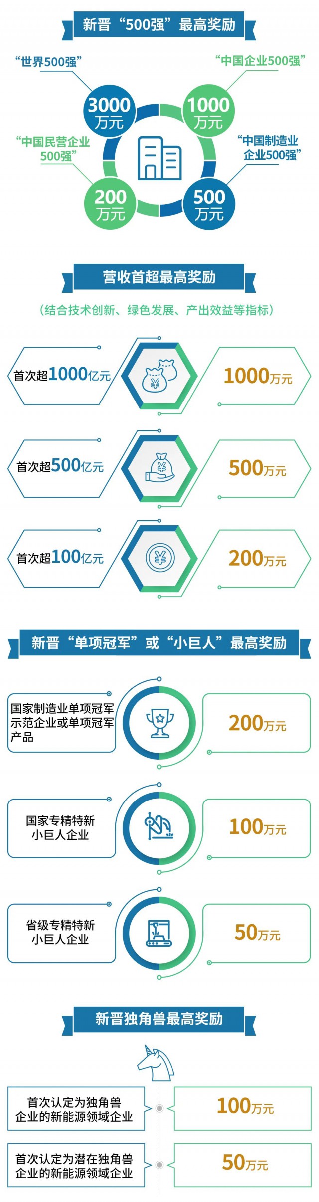 ② 三新經(jīng)濟(jì)項(xiàng)目:按新注冊設(shè)立的獨(dú)立法人企業(yè)投產(chǎn)1年內(nèi)地方貢獻(xiàn)總額的20%獎勵,單個項(xiàng)目最高獎勵500萬元。