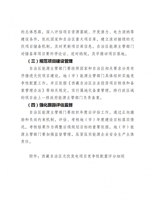 西藏自治區(qū)光伏發(fā)電項(xiàng)目競(jìng)爭(zhēng)性配置評(píng)分細(xì)則規(guī)定了儲(chǔ)能配置方案,評(píng)分滿分為100分,其中儲(chǔ)能滿分為10分。新建儲(chǔ)能容量按光伏備案容量的20%,儲(chǔ)能時(shí)長(zhǎng)4小時(shí)配置的,得5分;在此基礎(chǔ)上儲(chǔ)能時(shí)長(zhǎng)每增加1小時(shí),增加1分,直至滿分。