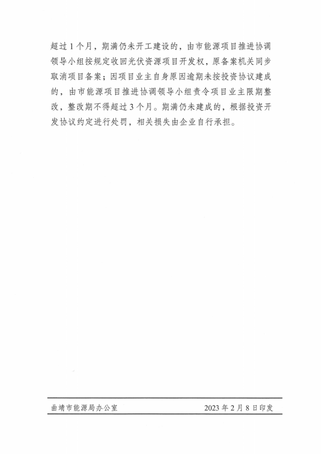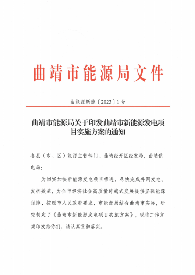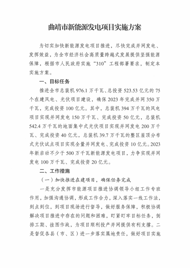 2月8日,曲靖市能源局關(guān)于印發(fā)曲靖市新能源發(fā)電項目實施方案的通知。通知顯示,為切實加快新能源發(fā)電項目推進,盡快完成并網(wǎng)發(fā)電、發(fā)揮效益,曲靖市全力推進全市總裝機976.1萬千瓦、總投資523.53億元的75個在建風電、光伏項目建設(shè),確保2023年完成并網(wǎng)350萬千瓦,完成投資100億元。