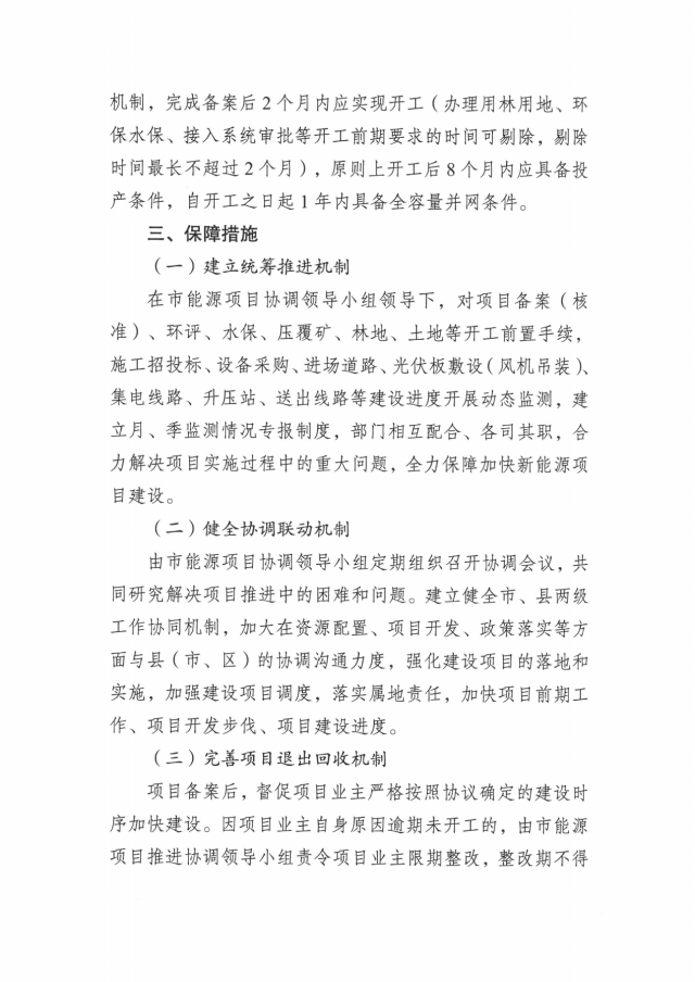 按照相關(guān)文件要求,科學的市場化原則擇優(yōu)項目業(yè)主,簽訂項目投資開發(fā)協(xié)議時,明確開工時限、投產(chǎn)時限和收回機制,完成備案后2個月內(nèi)應(yīng)實現(xiàn)開工(辦理用林用地、環(huán) 保水保、接入系統(tǒng)審批等開工前期要求的時間可剔除,剔除 時間最長不超過2個月),原則上開工后8個月內(nèi)應(yīng)具備投產(chǎn)條件,自開工之日起1年內(nèi)具備全容量并網(wǎng)條件。