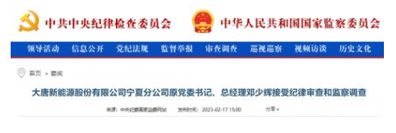 中央紀(jì)委國家監(jiān)委網(wǎng)站2月17日消息,據(jù)中國大唐集團(tuán)有限公司紀(jì)檢監(jiān)察組、寧夏回族自治區(qū)監(jiān)察委員會(huì)消息:大唐新能源股份有限公司寧夏分公司原黨委書記、總經(jīng)理鄧少輝涉嫌嚴(yán)重違紀(jì)違法,目前正接受中國大唐集團(tuán)有限公司紀(jì)檢監(jiān)察組紀(jì)律審查和寧夏回族自治區(qū)銀川市監(jiān)察委員會(huì)監(jiān)察調(diào)查。