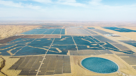 達(dá)拉特旗位于庫(kù)布其沙漠東端,近年來(lái)將防沙治沙與綠色發(fā)展相結(jié)合,依托當(dāng)?shù)刎S富的土地和光照資源積極發(fā)展新能源產(chǎn)業(yè)。截至目前,達(dá)拉特旗已建成100萬(wàn)千瓦裝機(jī)規(guī)模的光伏發(fā)電基地,年發(fā)電量可達(dá)20億度。