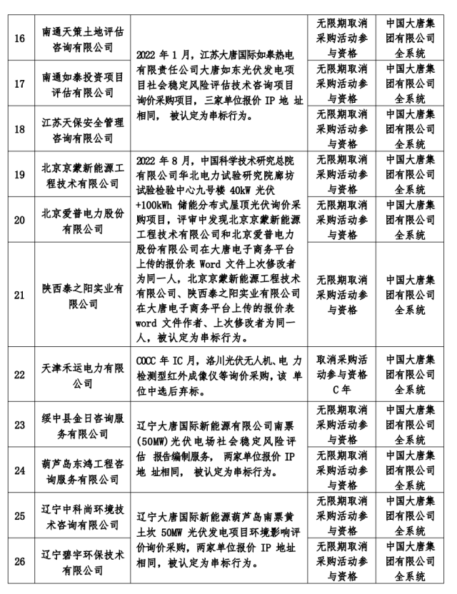 3月1日,大唐集團(tuán)發(fā)布2023年第2批關(guān)于供應(yīng)商不良行為處理情況的公告,共有699家企業(yè)被點(diǎn)名。其中,包含12個(gè)光伏項(xiàng)目招標(biāo)相關(guān)的26家供應(yīng)商被點(diǎn)名。