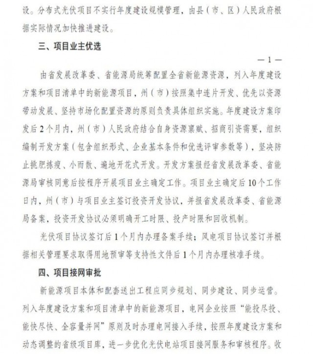 根據(jù)文件,年度方案的制定由省能源局會(huì)同各州、市根據(jù)項(xiàng)目成熟度和接網(wǎng)條件,對(duì)省級(jí)項(xiàng)目庫的項(xiàng)目進(jìn)行建設(shè)時(shí)序排序。年度建設(shè)方案印發(fā)后 2個(gè)月內(nèi),州(市)人民政府結(jié)合自身資源稟賦、招商引資需要,組織編制開發(fā)方案(包含組織形式、企業(yè)基本條件和優(yōu)選評(píng)審參數(shù)等),堅(jiān)決防止挑肥揀瘦、小而散、遍地開花式開發(fā)。