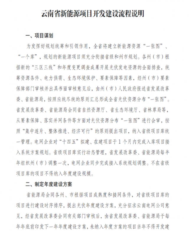 日前,云南省能源局發(fā)布《新能源項(xiàng)目開發(fā)建設(shè)流程說明》。說明指出,州(市)人民政府結(jié)合自身資源稟賦、招商引資需要,組織編制開發(fā)方案(包含組織形式、企業(yè)基本條件和優(yōu)選評(píng)審參數(shù)等)。