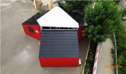 值得一提的是,此次“方寸空間微型幼兒園”為適應(yīng)溫帶半干旱氣候地區(qū)環(huán)境,設(shè)計聚落型房屋,三個單坡頂圍合中庭,外圍空間布局幼兒教學(xué)及活動空間,中間高聳采光空間成為舞臺,三個房屋之間設(shè)計通高玻璃隔斷,其中南面成為主入口,而另外兩個方向作為通風(fēng)口,中庭不僅作為幼兒很好的展示游樂場所,也可減少白天刺眼陽光與熱量。房屋四面減少窗戶以增強(qiáng)保溫隔熱,中庭設(shè)計高窗及垂直條形開口,作為主要采光通風(fēng),天氣好時可將門打開,提供良好通風(fēng)。“方寸空間微型幼兒園”做到了在陽光明媚的日子里,光伏瓦屋面提供室內(nèi)外所有的電力需求,用不完的電能自動進(jìn)入儲能電池供應(yīng)陰雨天和夜間照明及電器用電。“方寸空間微型幼兒園”屋面采用可完全替代傳統(tǒng)瓦片的光伏瓦片,既解決以前光伏板左右搭接處滲漏隱患,又保證光伏瓦片搭接處平整,為學(xué)生們提供更好的學(xué)習(xí)環(huán)境。學(xué)校還可以把用不完的電賣給國家電網(wǎng),收入可用于進(jìn)一步改善學(xué)校的環(huán)境。