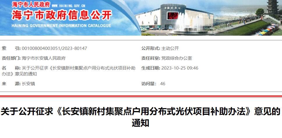 10月25日,浙江海寧市長(zhǎng)安鎮(zhèn)人民政府關(guān)于公開征求《長(zhǎng)安鎮(zhèn)新村集聚點(diǎn)戶用分布式光伏項(xiàng)目補(bǔ)助辦法》意見的通知。文件指出,為加快統(tǒng)籌推進(jìn)全鎮(zhèn)新村集聚點(diǎn)戶用分布式光伏項(xiàng)目建設(shè),特制《長(zhǎng)安鎮(zhèn)新村集聚點(diǎn)戶用分布式光伏項(xiàng)目補(bǔ)助辦法》。