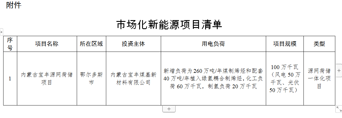 內(nèi)蒙古寶豐源網(wǎng)荷儲一體化項目,新增負荷為260萬噸/年煤制烯烴和配套40萬噸/年植入綠氫耦合制烯烴,化工負荷60萬千瓦,制氫負荷20萬千瓦,新能源建設規(guī)模為100萬千瓦(其中,風電50萬千瓦、光伏50萬千瓦),儲能規(guī)模為20萬千瓦/60萬千瓦時。