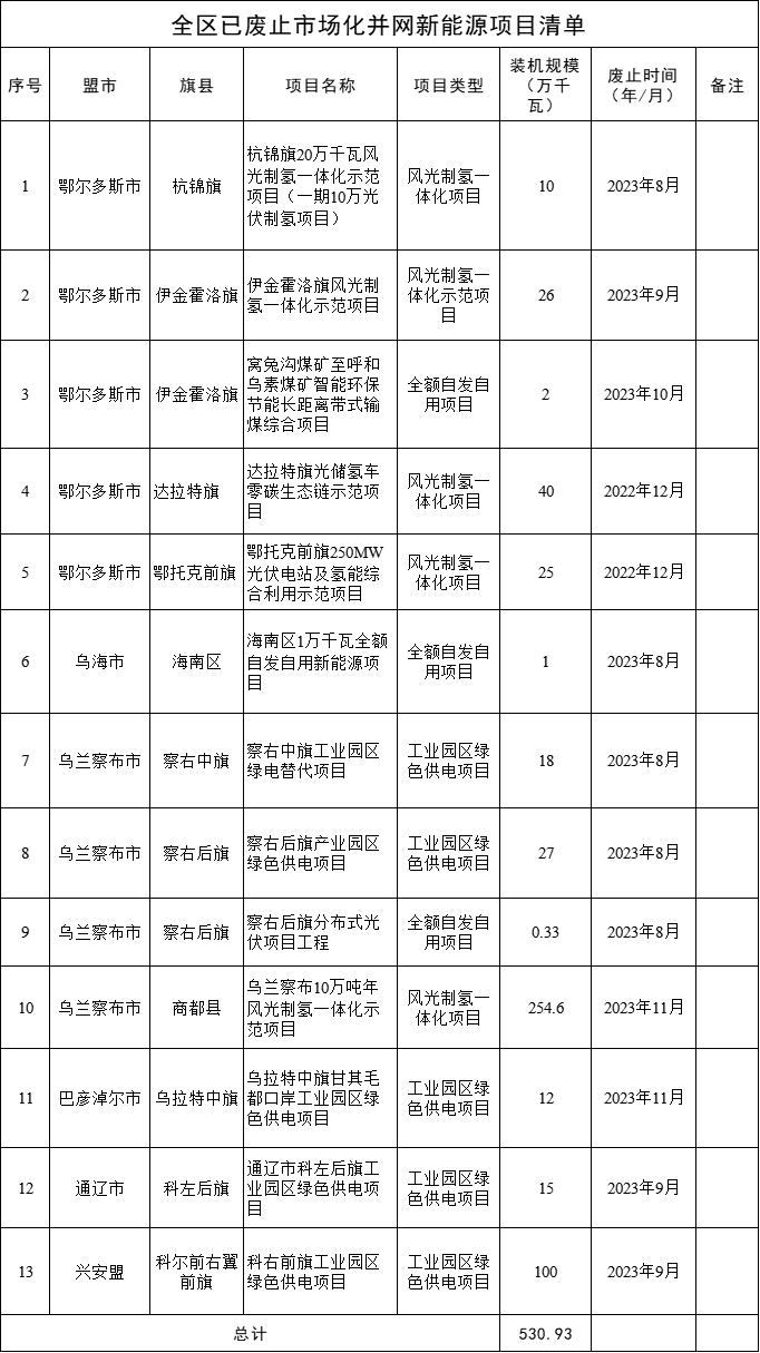 12月4日,內(nèi)蒙古自治區(qū)能源局對各盟市已廢止的市場化并網(wǎng)新能源項(xiàng)目進(jìn)行了公告,合計(jì)13個項(xiàng)目,涉及裝機(jī)規(guī)模超530萬千瓦,項(xiàng)目清單如下:
