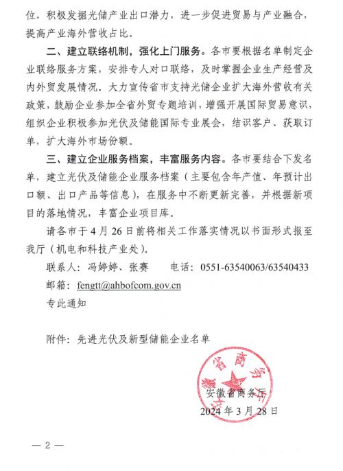 文件要求,各市要根據(jù)名單制定企業(yè)聯(lián)絡(luò)服務(wù)方案,安排專人對(duì)口聯(lián)絡(luò),及時(shí)掌握企業(yè)生產(chǎn)經(jīng)營及內(nèi)外貿(mào)發(fā)展情況。大力宣傳省市支持光儲(chǔ)企業(yè)擴(kuò)大海外營收有關(guān)政策,鼓勵(lì)企業(yè)參加全省外貿(mào)專題培訓(xùn),增強(qiáng)開展國際貿(mào)易意識(shí)組織企業(yè)積極參加光伏及儲(chǔ)能國際專業(yè)展會(huì),結(jié)識(shí)客戶、獲取訂單,擴(kuò)大海外市場(chǎng)份額。