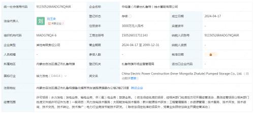 企查查顯示,4月17日,中電建(內(nèi)蒙古扎魯特)抽水蓄能有限公司成立,法定代表人為劉玉含,注冊資本3000萬人民幣,經(jīng)營范圍含風力發(fā)電技術服務、太陽能發(fā)電技術服務、新興能源技術研發(fā)、電力行業(yè)高效節(jié)能技術研發(fā)等。