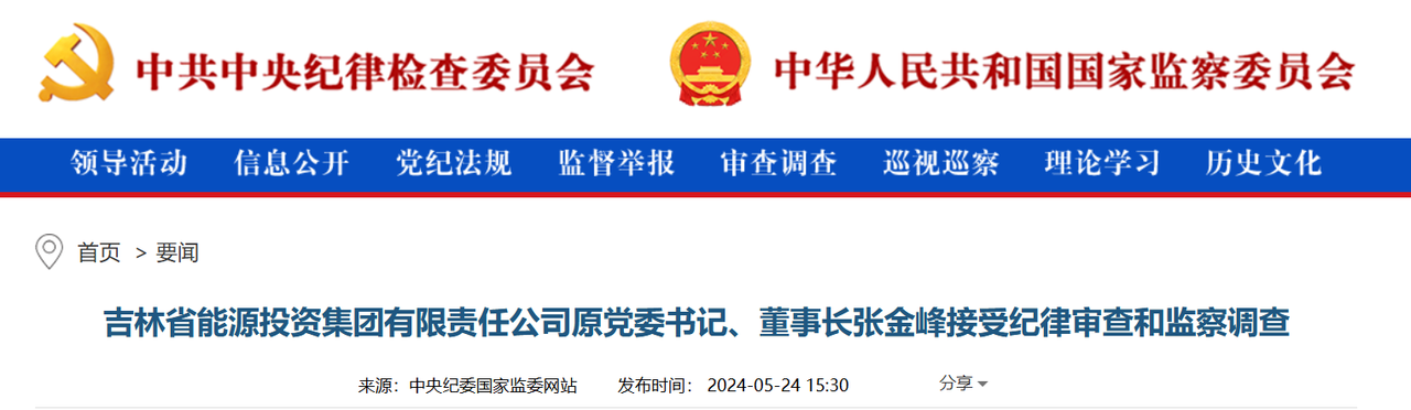 中央紀(jì)委國家監(jiān)委網(wǎng)站5月24日消息,據(jù)吉林省紀(jì)委監(jiān)委消息:吉林省能源投資集團(tuán)有限責(zé)任公司原黨委書記、董事長張金峰涉嫌嚴(yán)重違紀(jì)違法,目前正接受吉林省紀(jì)委監(jiān)委紀(jì)律審查和監(jiān)察調(diào)查。