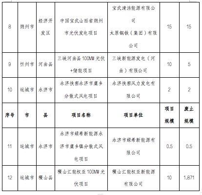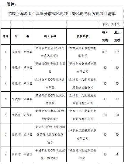 為提高我省新能源項(xiàng)目落地轉(zhuǎn)化率,加快推進(jìn)新能源建設(shè)進(jìn)度,我局組織各市能源局對(duì)2022年及之前取得批復(fù)且尚未全容量并網(wǎng)的風(fēng)電、光伏發(fā)電項(xiàng)目進(jìn)行了梳理。相關(guān)地市上報(bào)了擬廢止或核減規(guī)模項(xiàng)目清單,經(jīng)我局匯總,擬廢止渾源縣牛星堡分散式風(fēng)電等12個(gè)項(xiàng)目、規(guī)模91.981萬千瓦,現(xiàn)予以公示。相關(guān)企業(yè)如有異議,請向相關(guān)市能源局提出書面意見,并在公示期(5個(gè)工作日)內(nèi),由市能源局上報(bào)省能源局。