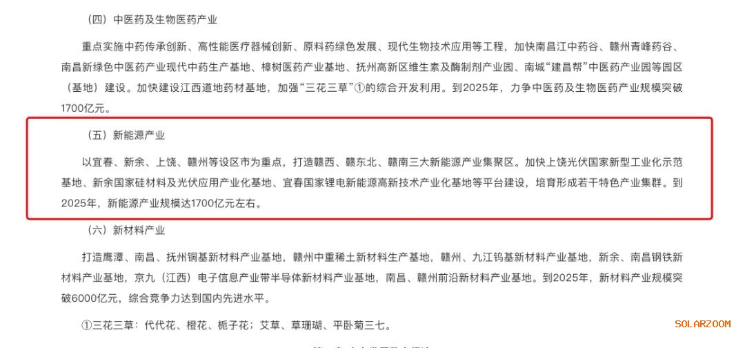 以宜春、新余、上饒、贛州等設(shè)區(qū)市為重點(diǎn),打造贛西、贛東北、贛南三大新能源產(chǎn)業(yè)集聚區(qū)。加快上饒光伏國(guó)家新型工業(yè)化示范基地、新余國(guó)家硅材料及光伏應(yīng)用產(chǎn)業(yè)化基地、宜春國(guó)家鋰電新能源高新技術(shù)產(chǎn)業(yè)化基地等平臺(tái)建設(shè),培育形成若干特色產(chǎn)業(yè)集群。到2025年,新能源產(chǎn)業(yè)規(guī)模達(dá)1700億元左右。