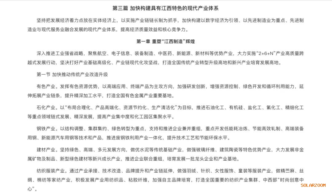 提升贛東北開(kāi)放合作水平,提升“兩光一車”(光伏、光學(xué)、汽車)產(chǎn)業(yè)發(fā)展水平,打造全國(guó)光伏光學(xué)產(chǎn)業(yè)基地。加快贛西轉(zhuǎn)型升級(jí)步伐,支持新余推進(jìn)鋼鐵、鋰電、硅灰石、光伏、電子信息等產(chǎn)業(yè)集群發(fā)展,打造中部地區(qū)新型工業(yè)強(qiáng)市、國(guó)家新能源科技示范城。