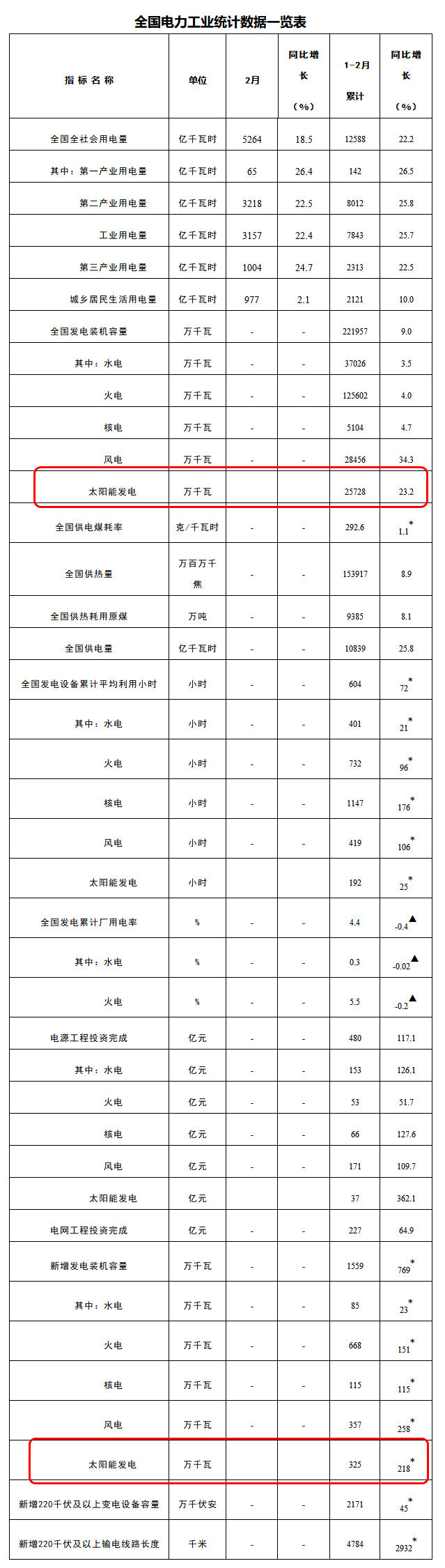 今年1-2月份,全國(guó)全社會(huì)用電量為12588億千瓦時(shí),同比增長(zhǎng)22.2%。全國(guó)發(fā)電裝機(jī)容量為221957萬(wàn)千瓦,同比上漲9%;其中太陽(yáng)能發(fā)電裝機(jī)容量25728萬(wàn)千瓦,同比增長(zhǎng)23.2%。