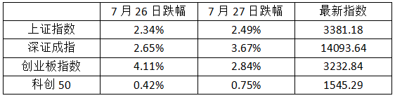 從7月26日起,A股經(jīng)歷連續(xù)兩日大跌,各版塊下跌情況見下表: