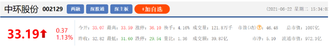 截至6月22日收盤(pán),中環(huán)股份(002129.SZ)股價(jià)為33.19元/股,總市值達(dá)到1007億元。