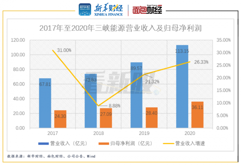三峽能源主營業(yè)務為風能、太陽能的開發(fā)、投資和運營。2018年至2020年,公司實現(xiàn)營業(yè)收入分別為73.83億元、89.57億元、113.15億元,同比分別增加8.88%、21.32%、26.33%;實現(xiàn)歸母凈利潤分別為27.09億元、28.40億元、36.11億元,同比分別增加11.48%、4.84%、27.16%。