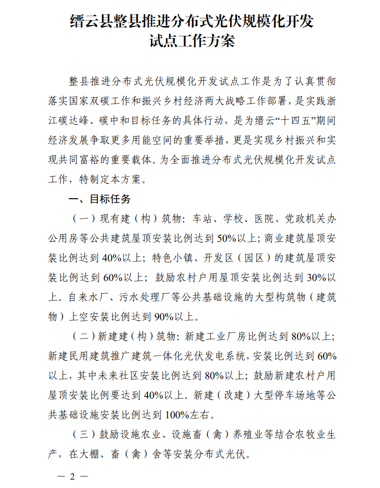 日前,縉云縣人民政府辦公室發(fā)布關(guān)于印發(fā)《縉云縣整縣推進(jìn)分布式光伏規(guī)?;_(kāi)發(fā)試點(diǎn)工作方案》《縉云縣分布式光伏資源調(diào)查摸底工作方案》的通知。通知明確,縉云縣整縣推進(jìn)分布式光伏規(guī)?;_(kāi)發(fā)試點(diǎn)工作目標(biāo)任務(wù)為: