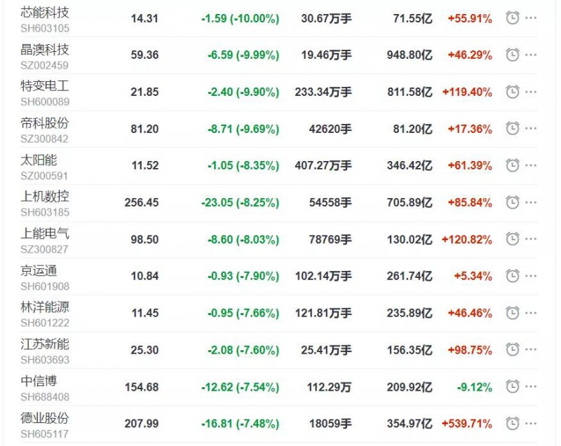 國慶假期后的第一個交易日,光伏板塊高開后一路下跌,截至收盤,光伏產(chǎn)業(yè)指數(shù)(東財)下跌2.8%,50支成分股僅有14家上漲,而跌幅超過5%的個股達(dá)到15家。其中,芯能科技和晶澳科技跌停,特變電工、太陽能盤中一度封死跌停。