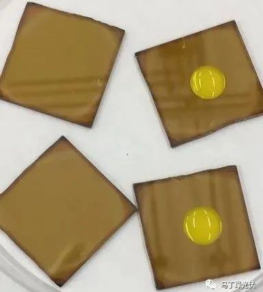 目前來(lái)看,鈣鈦礦材料對(duì)水汽或高溫較為敏感。直接暴露的高濕環(huán)境下,形成的鈣鈦礦結(jié)構(gòu)將會(huì)快速失效,變?yōu)榉氢}鈦礦結(jié)構(gòu),同時(shí)特有的棕褐色也會(huì)發(fā)生變化(如下圖,水滴滴在鈣鈦礦材料表面時(shí),顏色發(fā)生了明顯的變化。所以,材料穩(wěn)定性與封裝的研究至關(guān)重要。在2021年初,杭州纖納重磅宣布了全球首個(gè)通過(guò)了基于IEC61215標(biāo)準(zhǔn)的加嚴(yán)穩(wěn)定性證書(shū),邁出了鈣鈦礦組件商業(yè)化堅(jiān)實(shí)的一步。