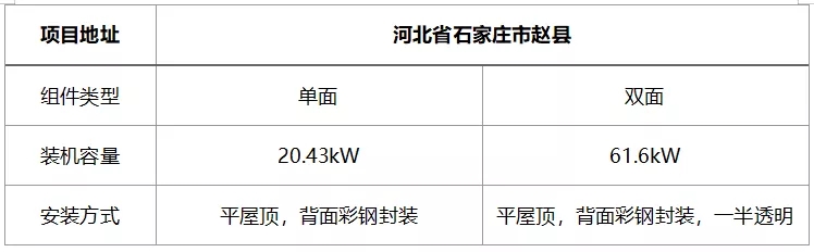 位于河北省石家莊趙縣一處居民平屋頂項(xiàng)目,安裝了雙面組件后同樣表現(xiàn)出很好的發(fā)電性能。由于居民屋頂為水泥屋頂,同時(shí)背面用彩鋼瓦封裝,選用了隆基PERC雙面組件,總裝機(jī)容量達(dá)61.6kWp。項(xiàng)目具體信息如下: