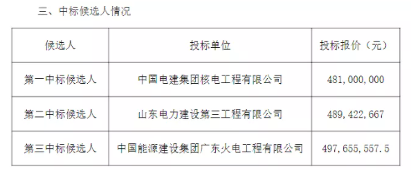 第一中標(biāo)候選人:中國(guó)電建集團(tuán)核電工程有限公司,投標(biāo)含稅總報(bào)價(jià)∶19762.307 萬(wàn)元,折合3.85元/W。