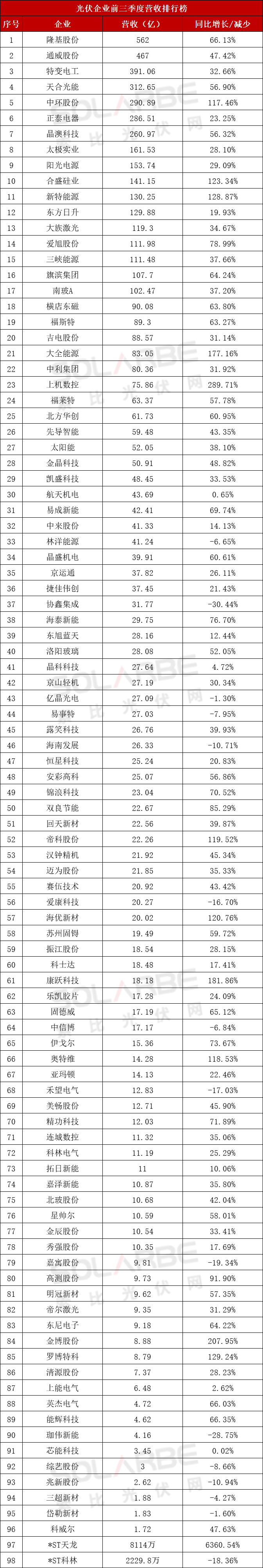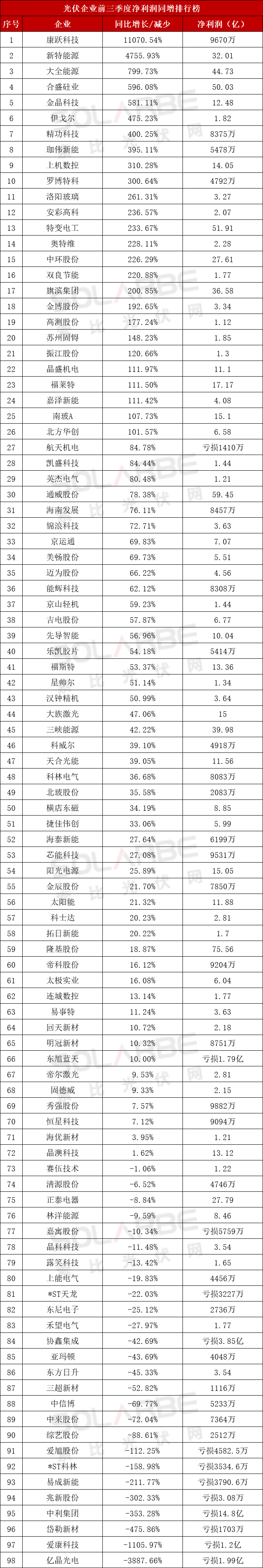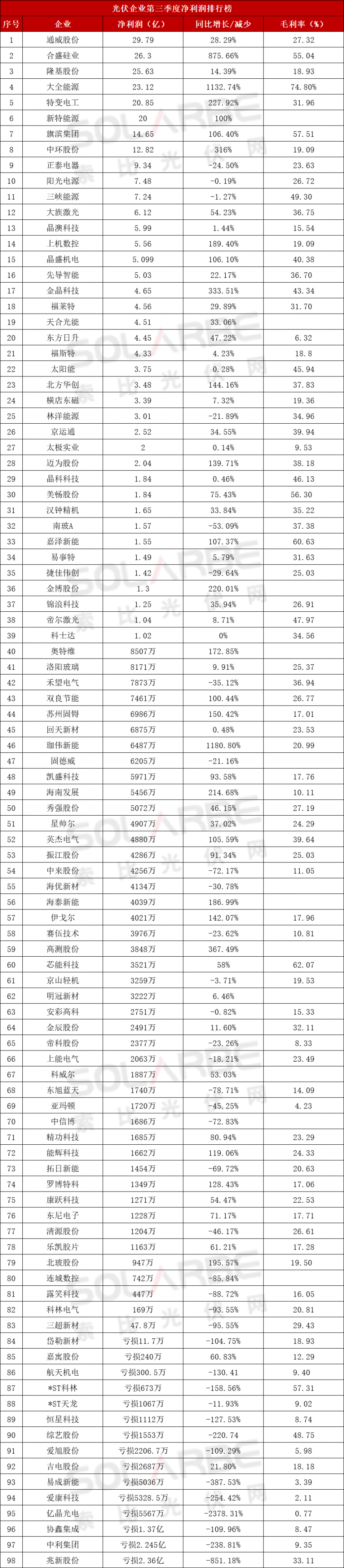 光伏企業(yè)前三季度凈利潤同增排行榜